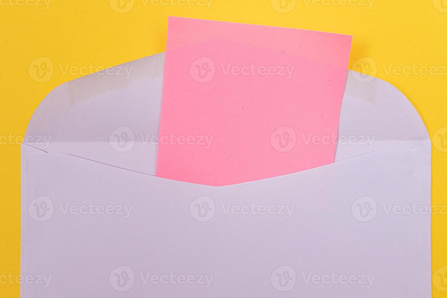 Violet Envelope with Blank Pink Sheet of Paper Inside, Lying on Yellow Background - Mock Up with Copy Space. Receiving Mail or Notice, Sending Postcard - Top View, Flat Lay Pro Photo