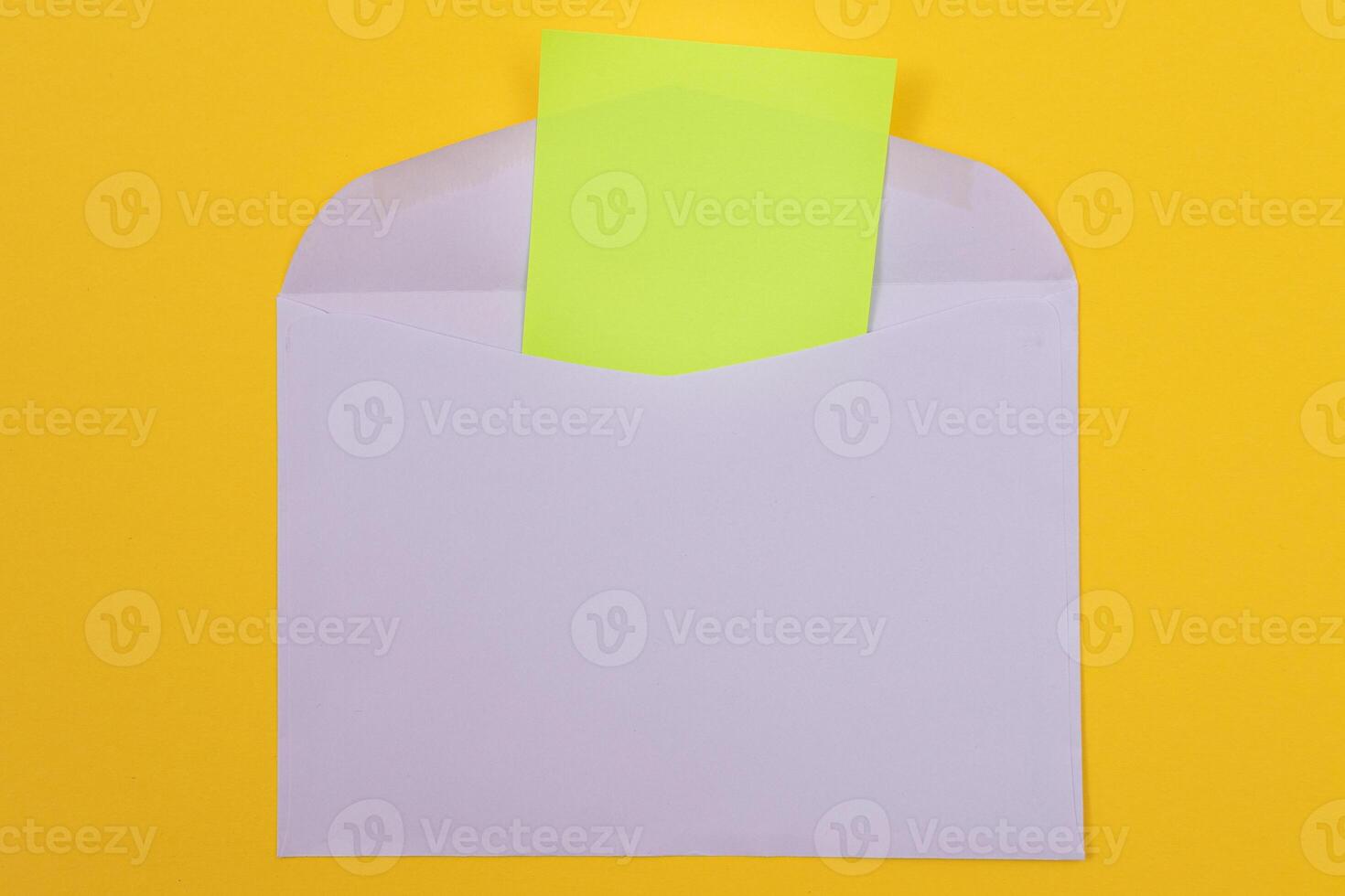 Violet Envelope with Blank Green Sheet of Paper Inside, Lying on Yellow Background - Mock Up with Copy Space. Receiving Mail or Notice, Sending Postcard - Top View, Flat Lay Pro Photo
