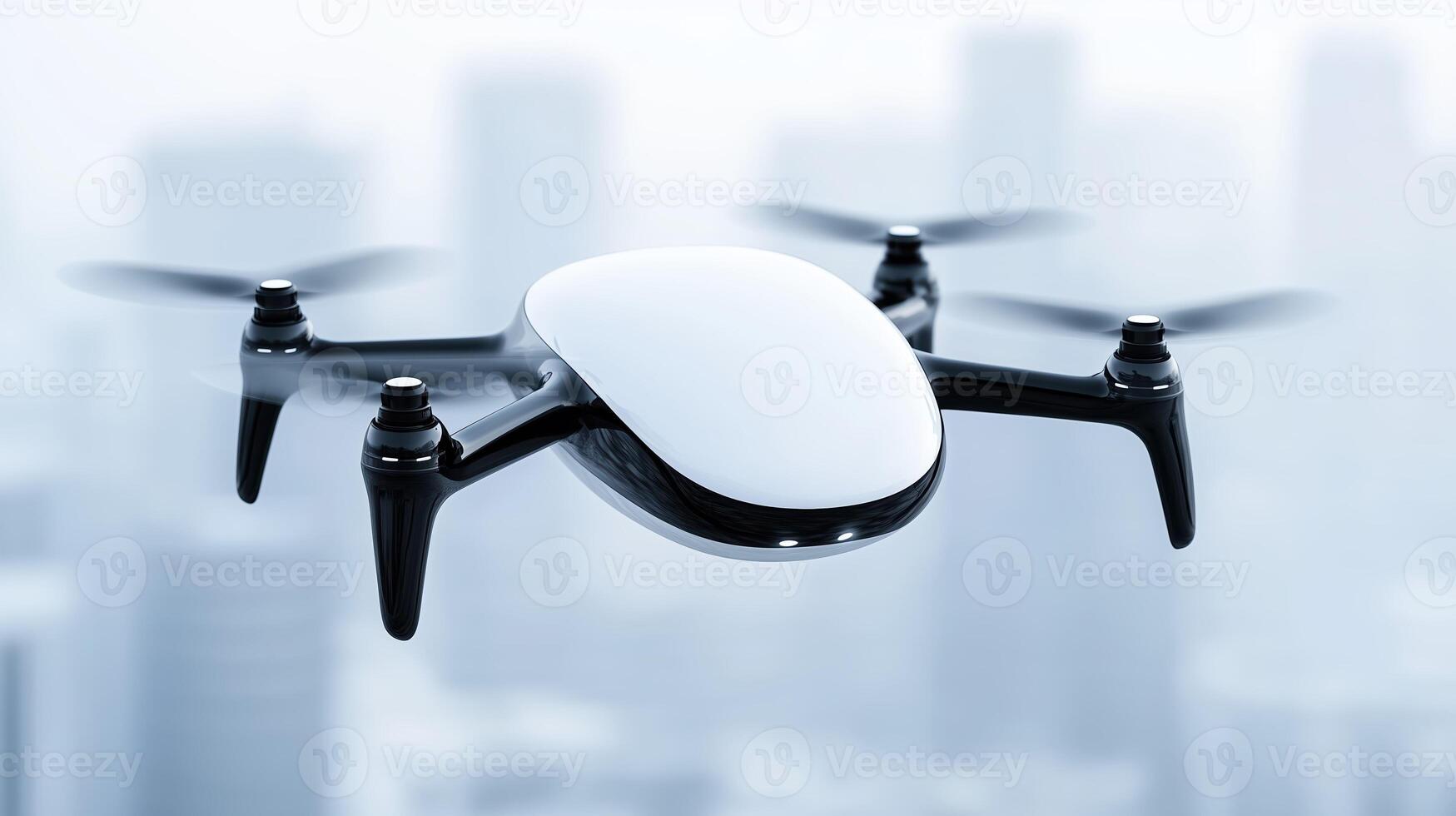 sleek, modern drone hovers in air against blurred cityscape background, showcasing its advanced design and technology. drones propellers spin rapidly, emphasizing its functionality and innovation Pro Photo