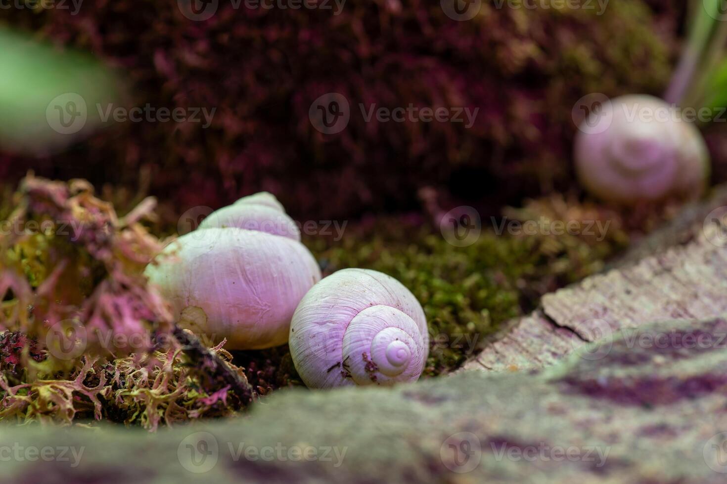 small white shells are on a mossy rock. The shells are arranged in a row, with one slightly larger than the other two Pro Photo