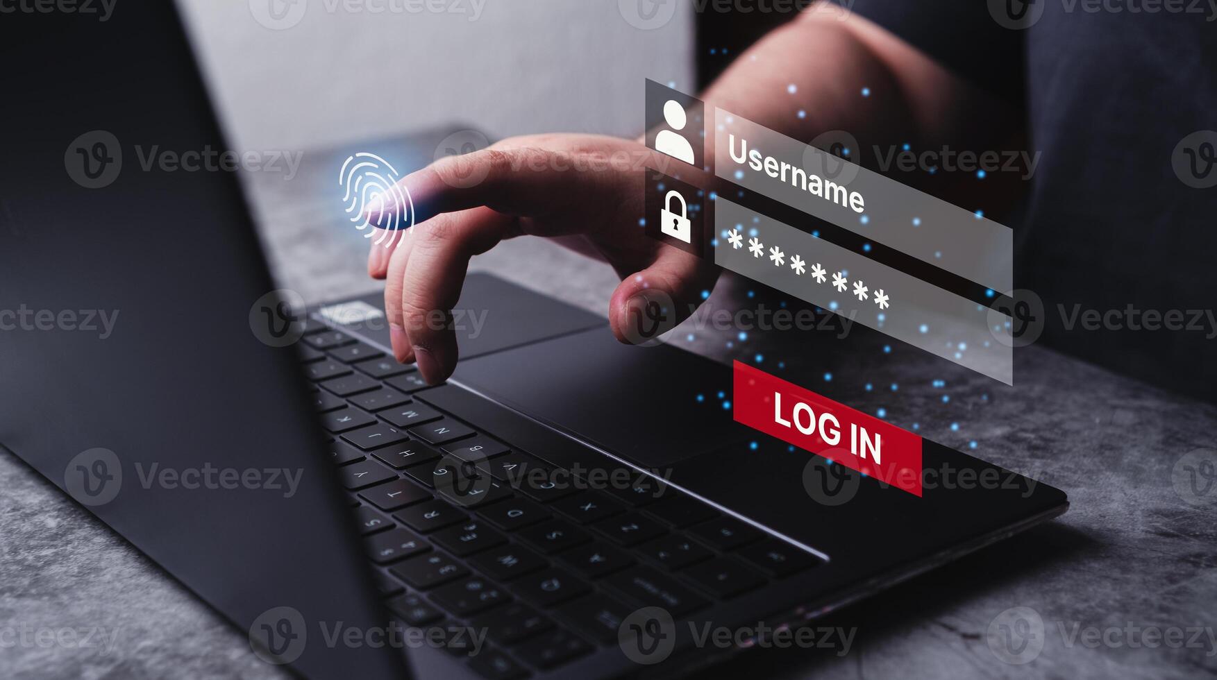 Woman use fingerprint scanner for cyber security log in online on laptop. Data protection from hacker. Pro Photo
