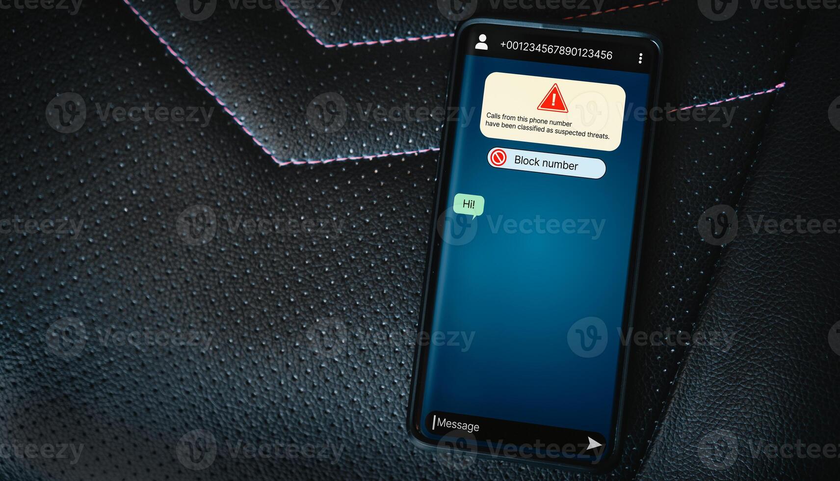Top view of smartphone screening message from suspected number scam. Unwanted anonymous call. Fraud and phishing phone concept. Message from stranger. Pro Photo