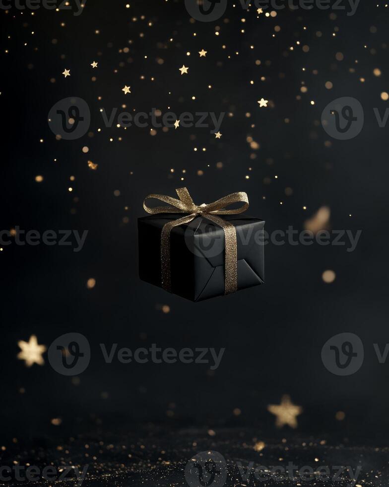 Minimalistic black present with gold ribbon, floating in mid-air with golden stars surrounding it, dark background with empty space at the top Pro Photo