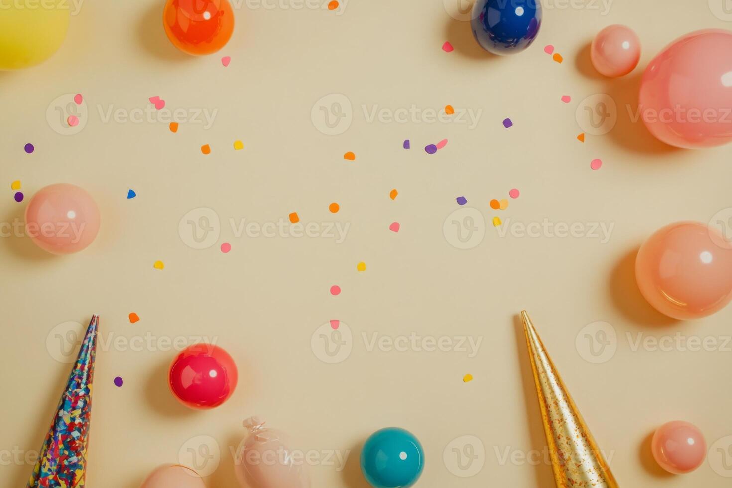 Flat lay with baubles, party horns, and confetti, arranged on a beige surface with empty space on the right Pro Photo