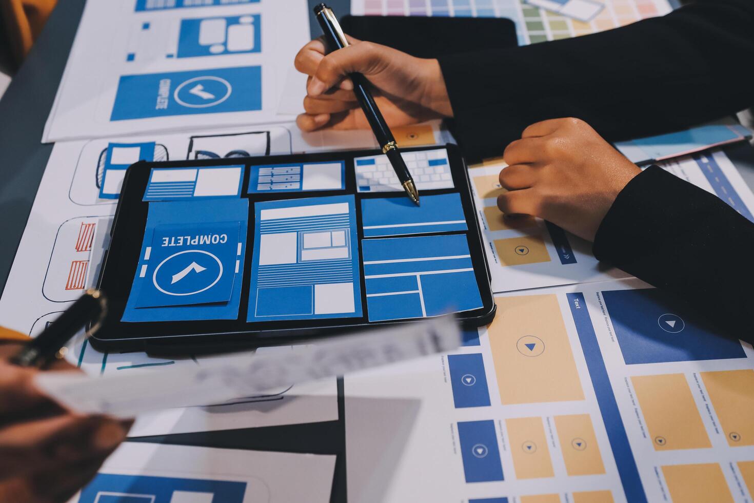 The designer team is designing the uxui system to make the uxui system work well on new phones and support system updates. Website development concept UI UX front end designer Free Photo