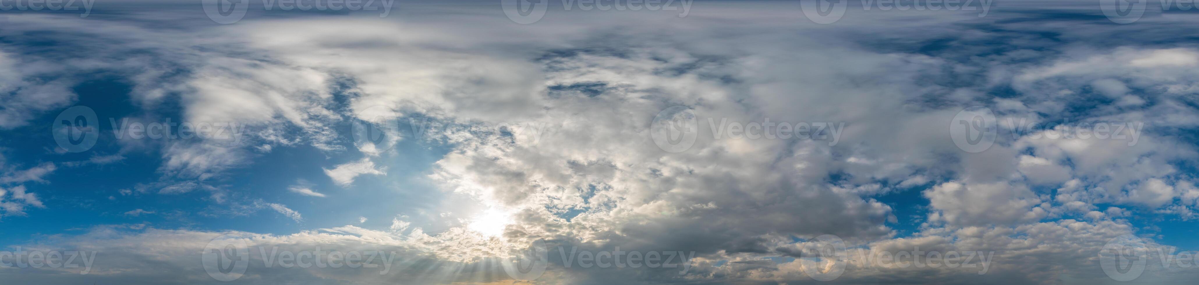 Blue sky with Cumulus clouds Seamless panorama in spherical equirectangular format. Complete zenith for use in 3D graphics, game and for composites in aerial drone 360 degree panoramas as a sky dome Pro Photo
