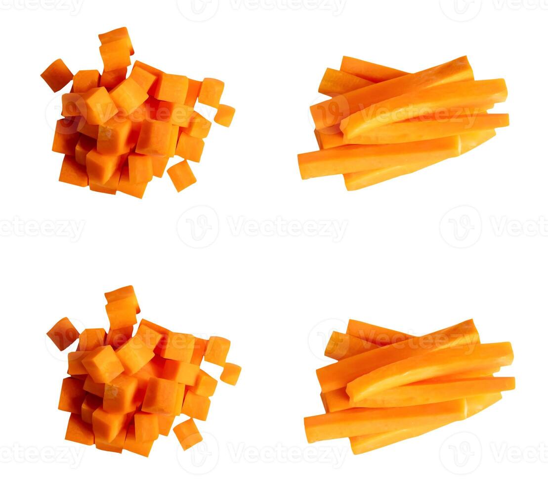 Top view set of orange carrot slices or pieces in stick and cube shapes in stack isolated on white background with clipping path Pro Photo