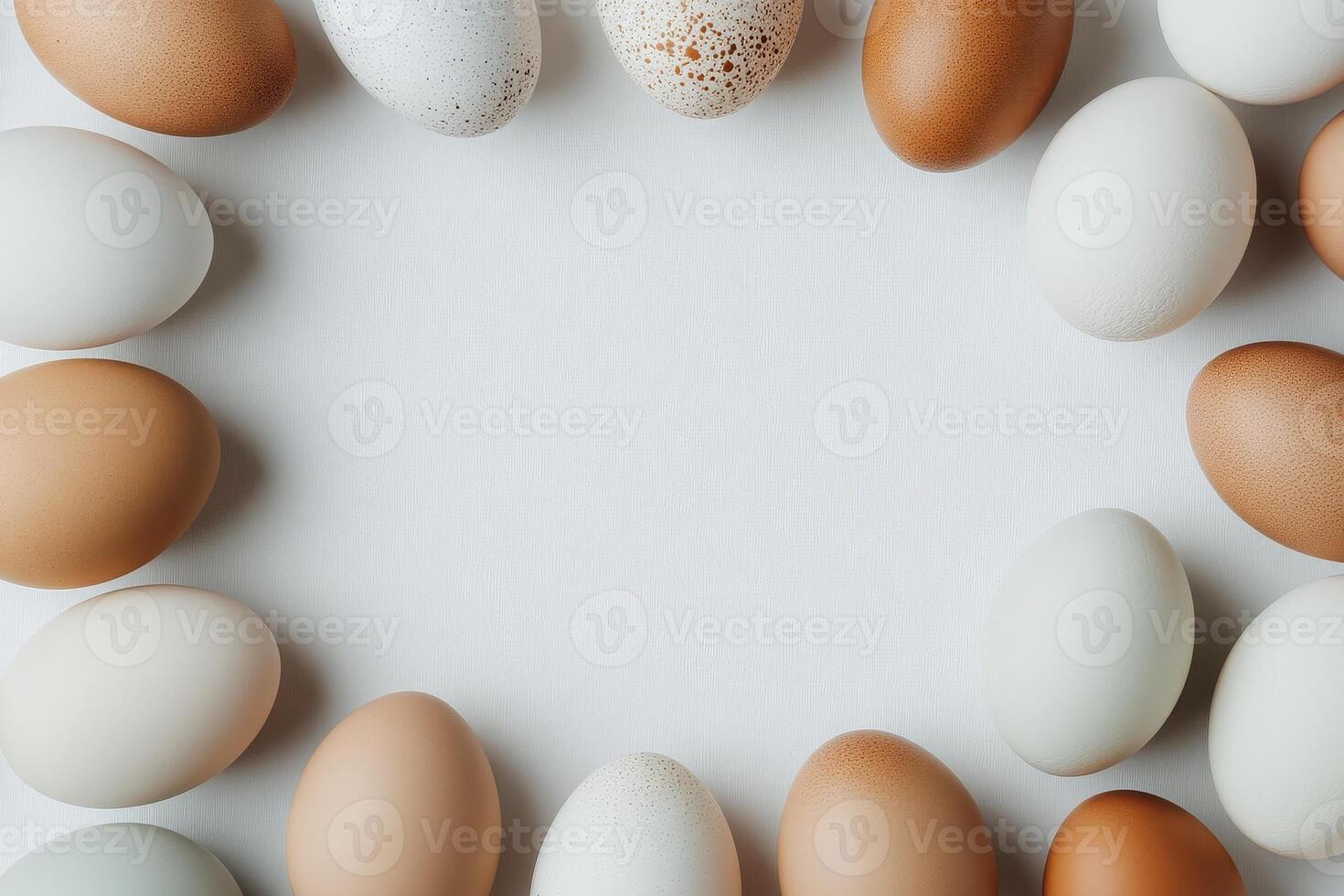 A collection of eggs in different shades of white and brown is arranged in a circular pattern on a light surface. The eggs create an appealing visual display centered in the frame. Pro Photo