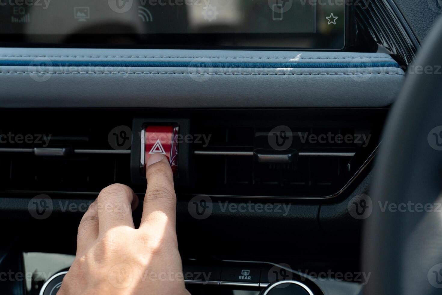 Hand pressing a red button warning emergency light on a car dashboard. The button is likely for an emergency stop or hazard light function. Pro Photo