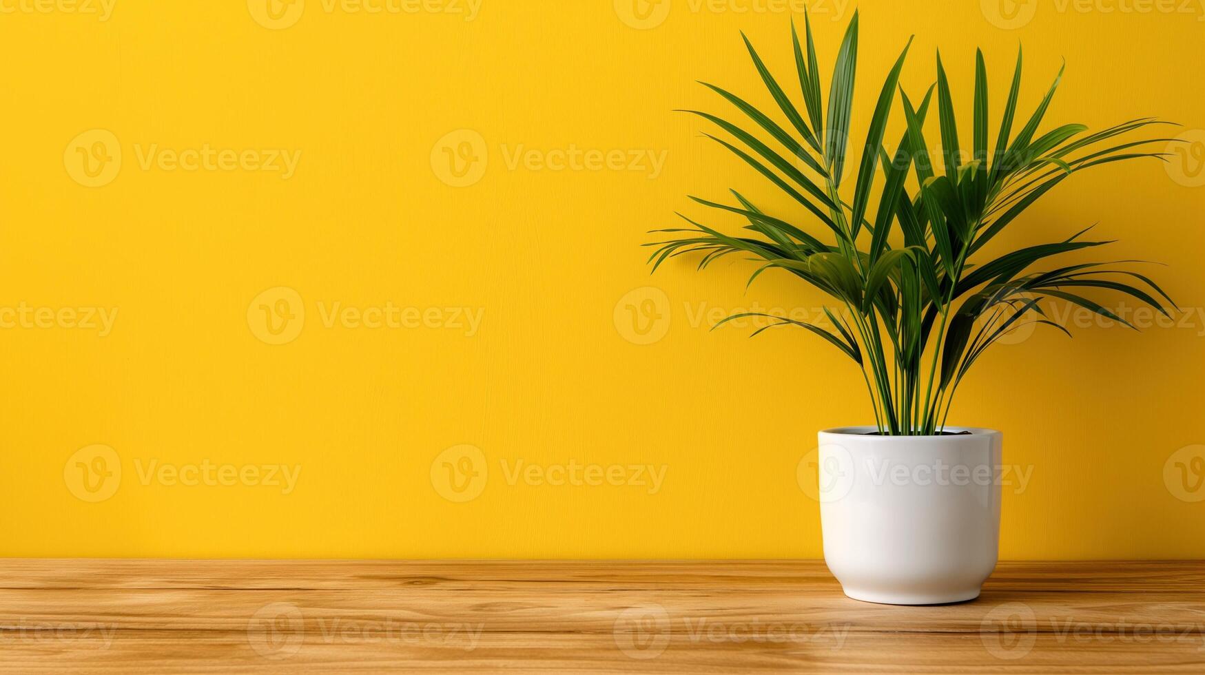 Potted palm on wooden display table banner background copy space. Product placement timber countertop image backdrop empty. Advertising concept composition front view, copyspace Pro Photo