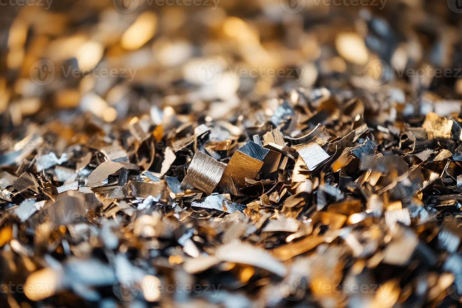 Shimmering metal shavings collected from machining process in a workshop environment Pro Photo