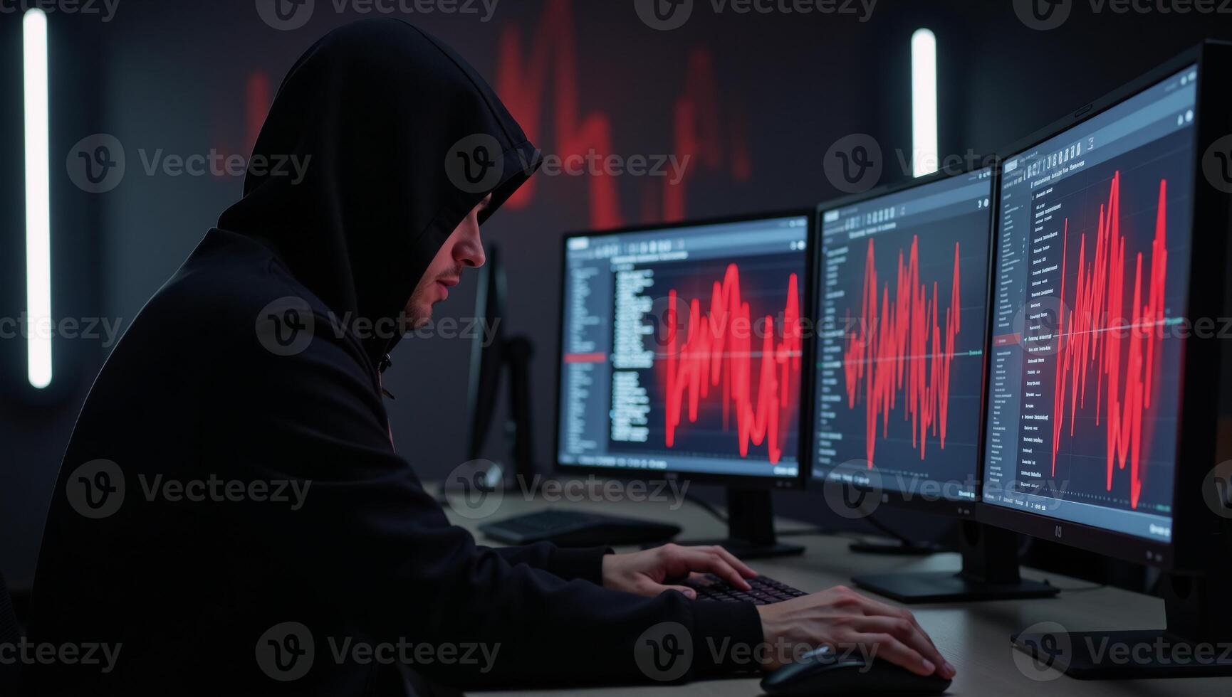 An intriguing hooded figure engrossed in cybersecurity data analysis amidst dynamic red digital visuals Pro Photo