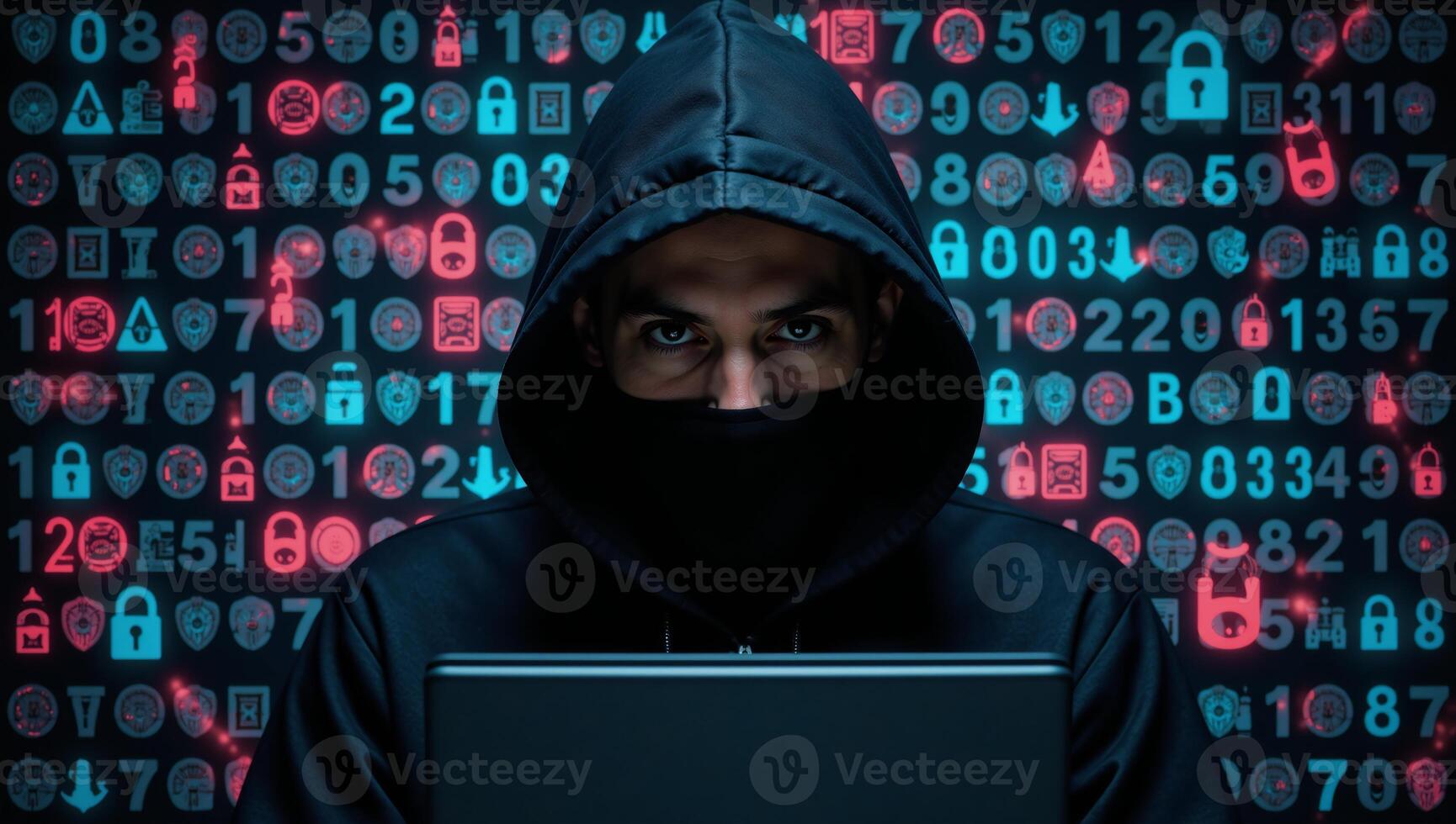 Illustrated cyber security scene with hacker in hoodie amidst encrypted data firewalls Pro Photo