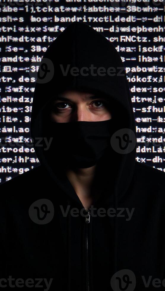 Hacker in hood against glitchy computer code backdrop Glitch Art Style Pro Photo