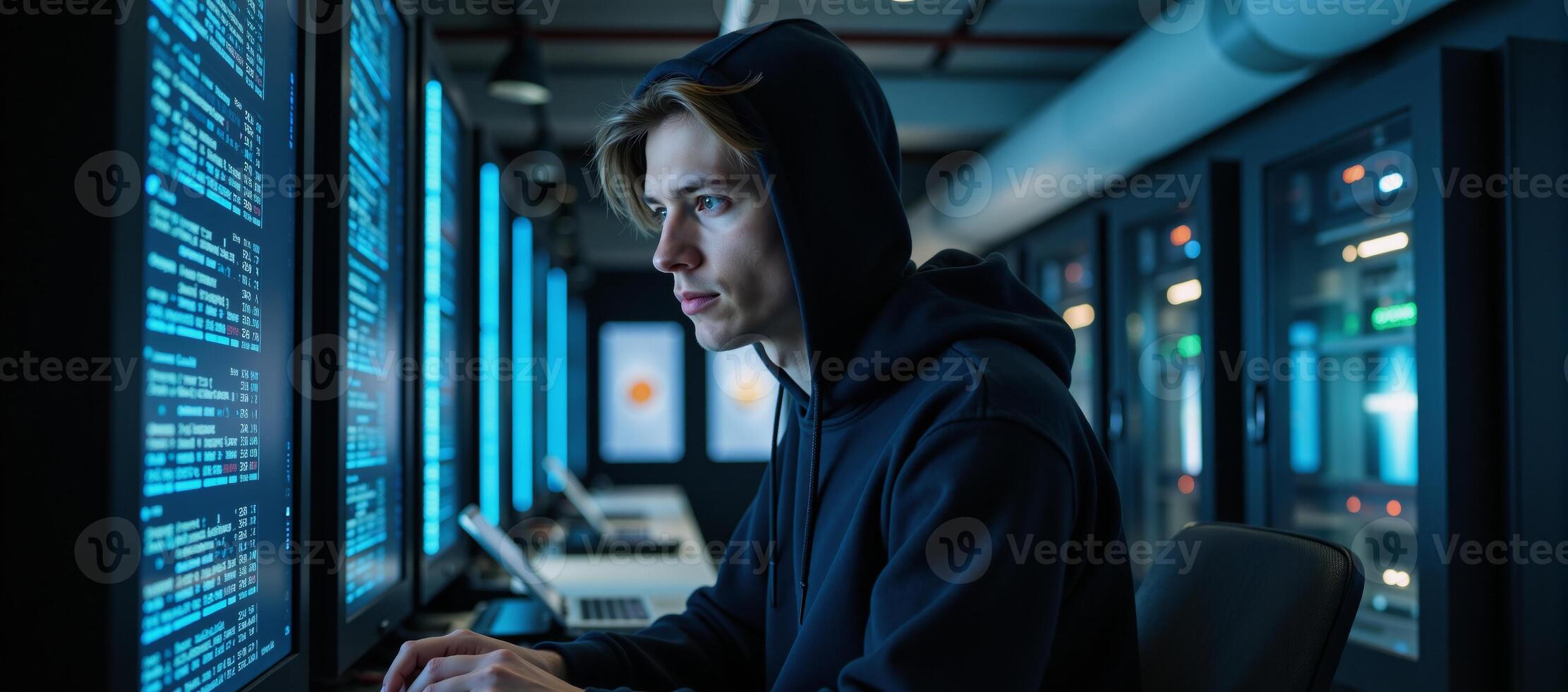 A Hacker in a Hoodie within a Data Center setting Pro Photo