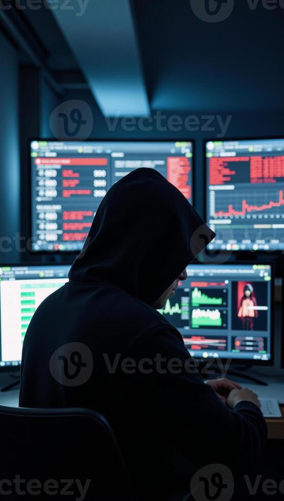 Hooded analyst engrossed in multiscreen data analysis within a cybersecurity environment surrounded by bold red digital elements Pro Photo