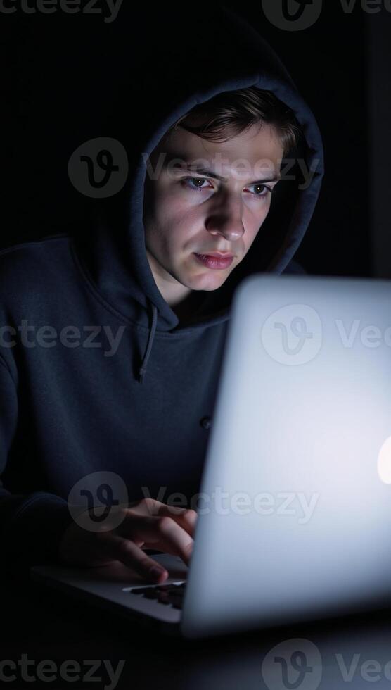 A hacker engages in cybercrime through his laptop on a dark backdrop while a young hacking prodigy battles him in an Internet Security Standoff Pro Photo