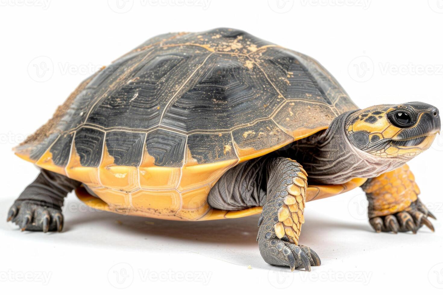 African Helmeted Turtle stands alone against a white backdrop highlighting its distinctive helmet shell and colorful patterns that attract attention. Pro Photo