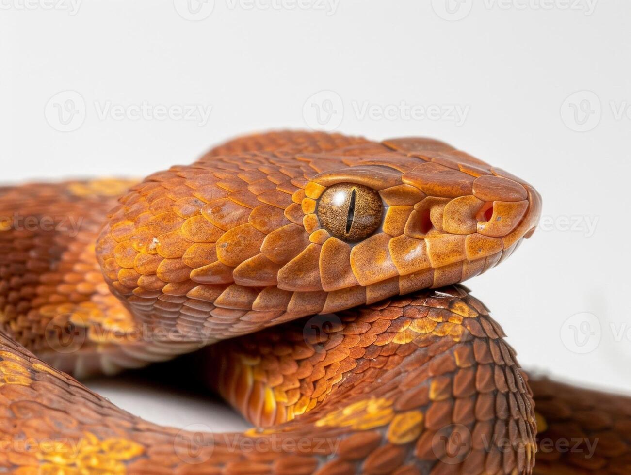 striking Copperhead Snake displays its vibrant copper scales while coiled in a dramatic pose. The unique side lighting enhances its intricate patterns against a white backdrop. Pro Photo