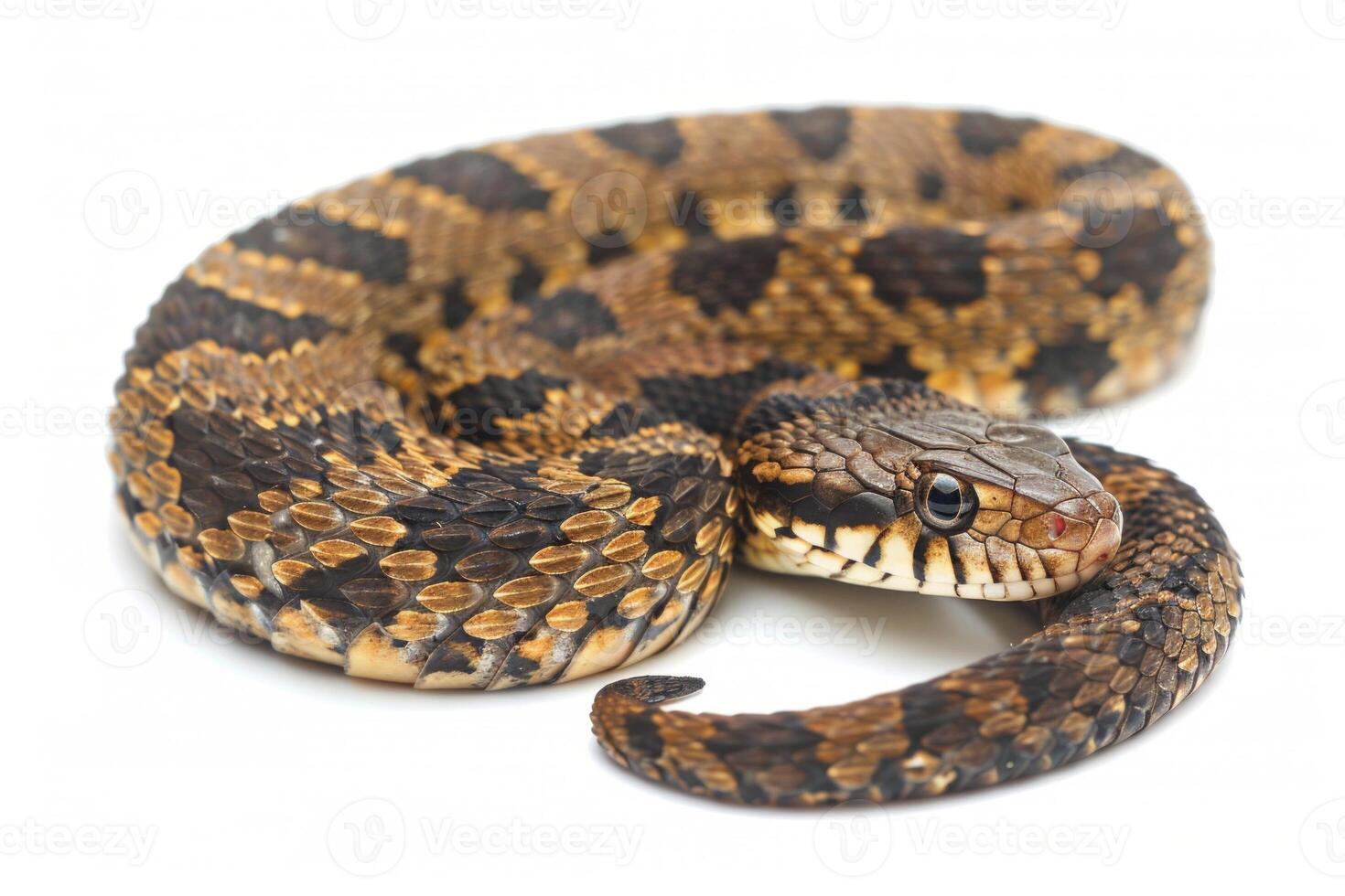 European Adder rests in a coiled position on a clean white background highlighting its unique zigzag patterns and intricate scales. The soft shadows enhance its striking appearance. Pro Photo