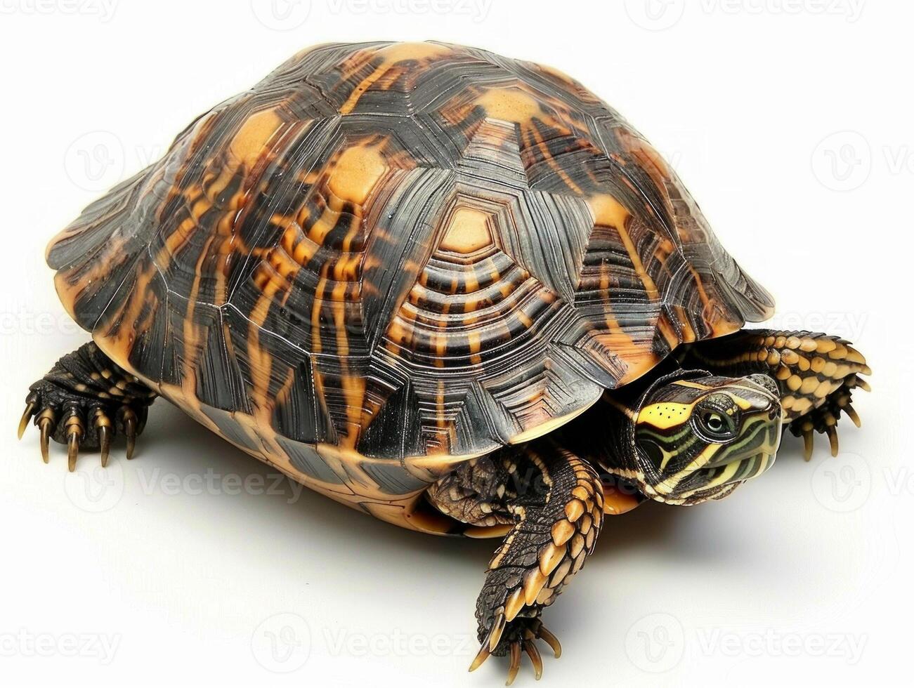 Keeled Box Turtle remains stationary against a white backdrop highlighting its unique raised keel and intricate shell patterns with soft shadows enhancing its features. Pro Photo