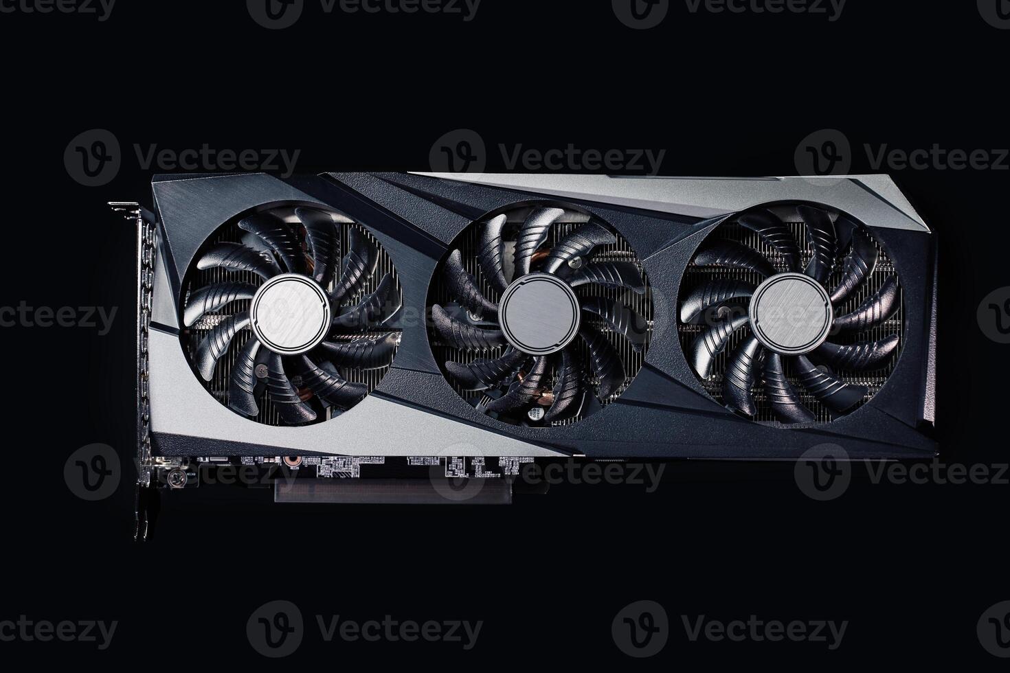 Close-up of high-performance graphics card with three cooling fans on dark background. Modern card for gaming and advanced computing Pro Photo