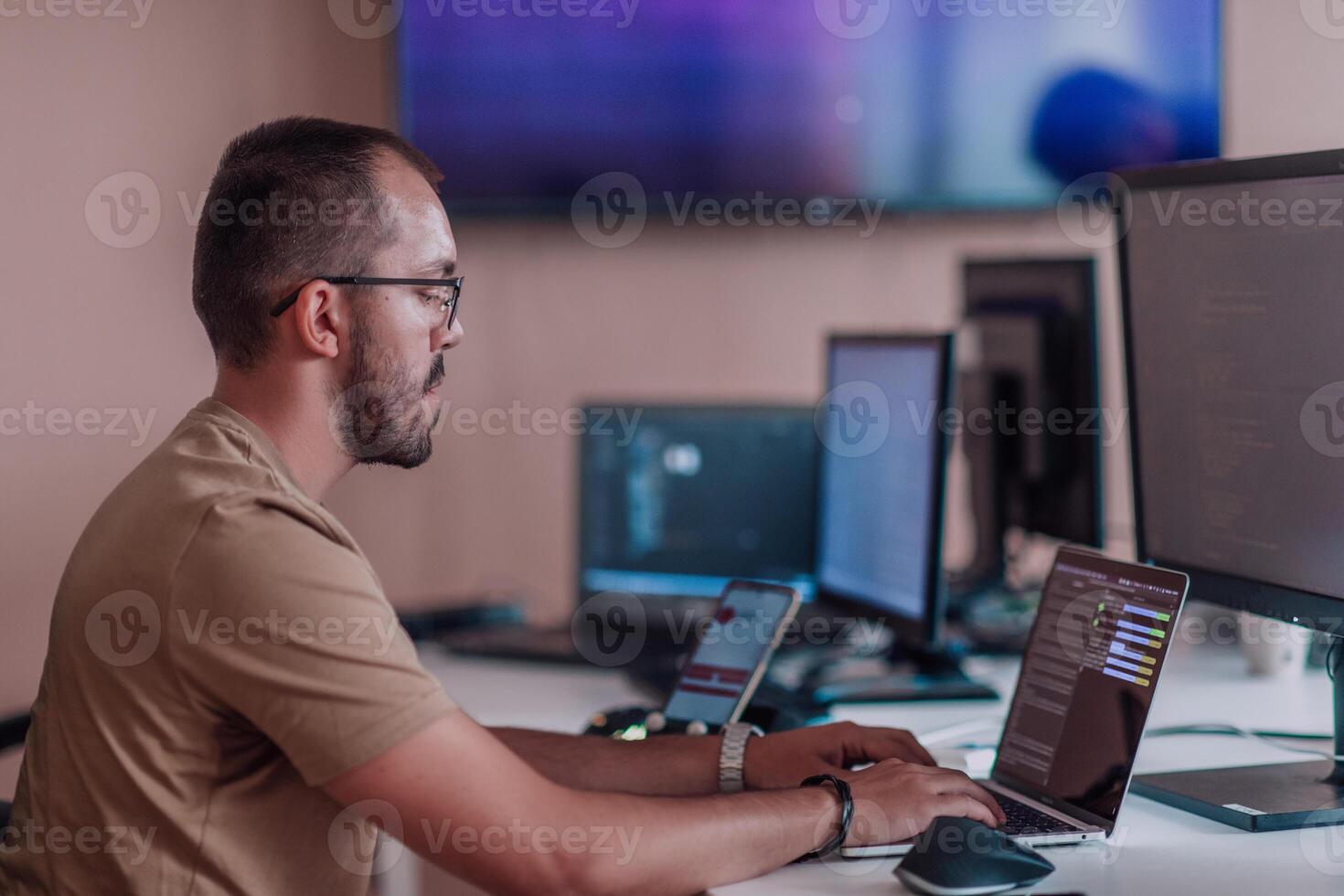 A programmer diligently testing smartphone applications while sitting in their office. Pro Photo