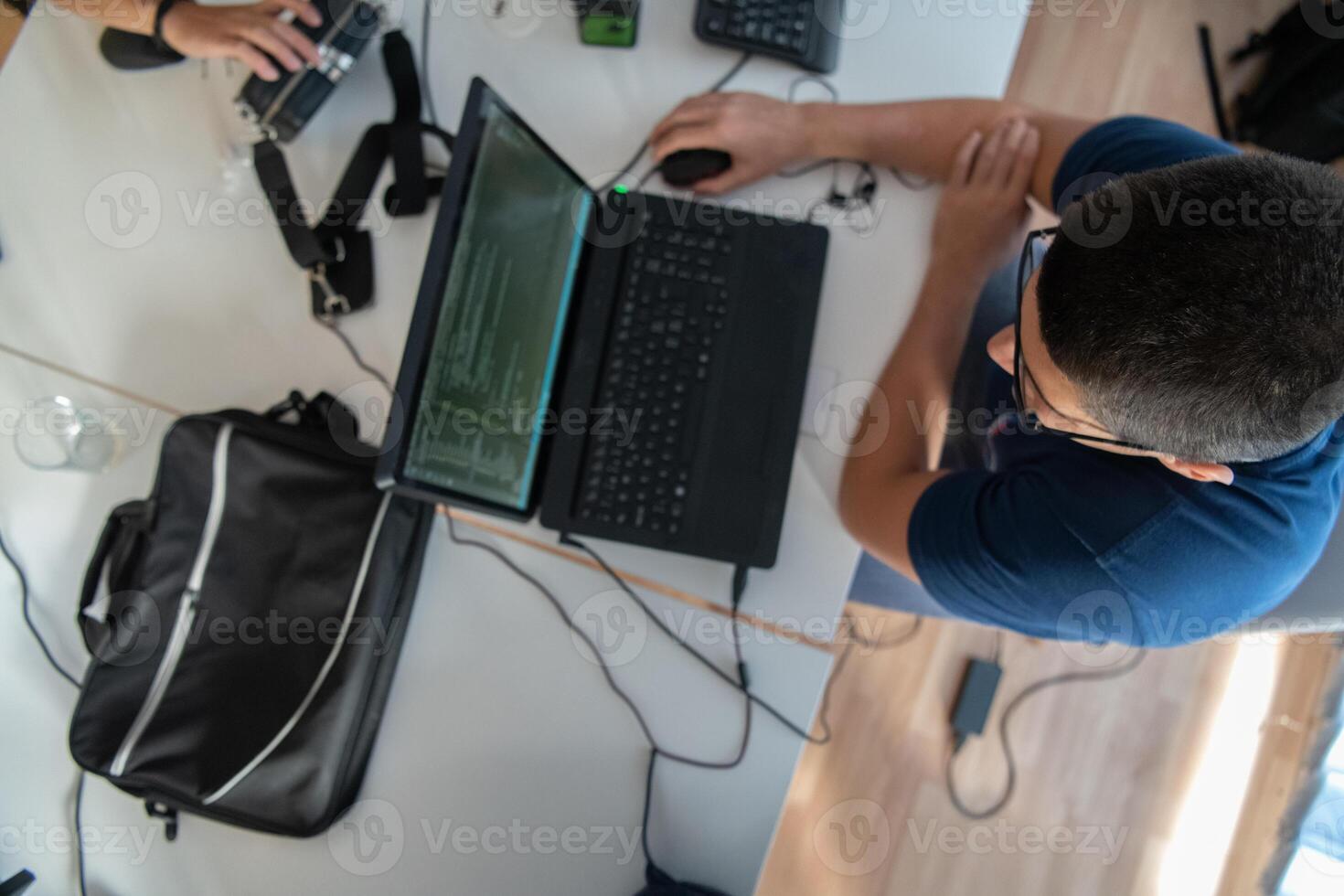 Top view of programmer diligently testing smartphone applications while sitting in their office. Pro Photo
