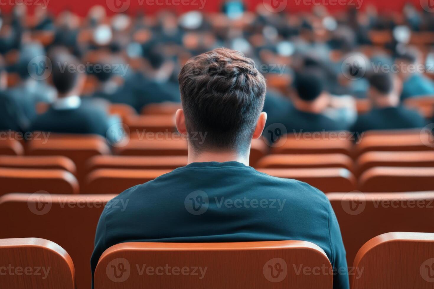 Thoughtful student in large lecture hall during university class with engaged professor in the background Pro Photo