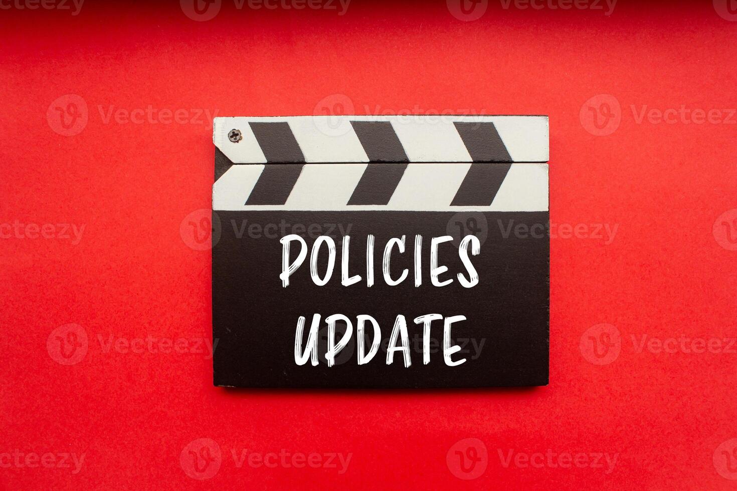 Policies update message written on clapperboard with red background. Conceptual policies update symbol. Copy space. Pro Photo