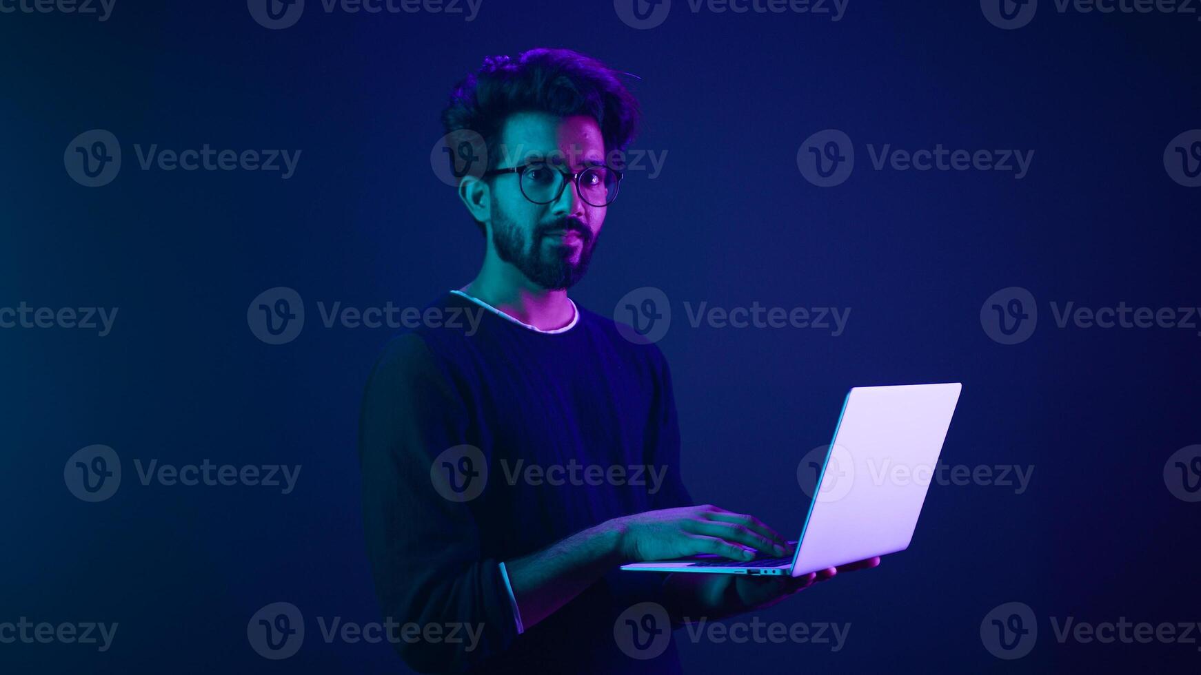 Arabian Indian man guy male programmer coder employer freelancer working using internet computer developer businessman business guy gamer hold laptop computer work in violet neon background network Pro Photo