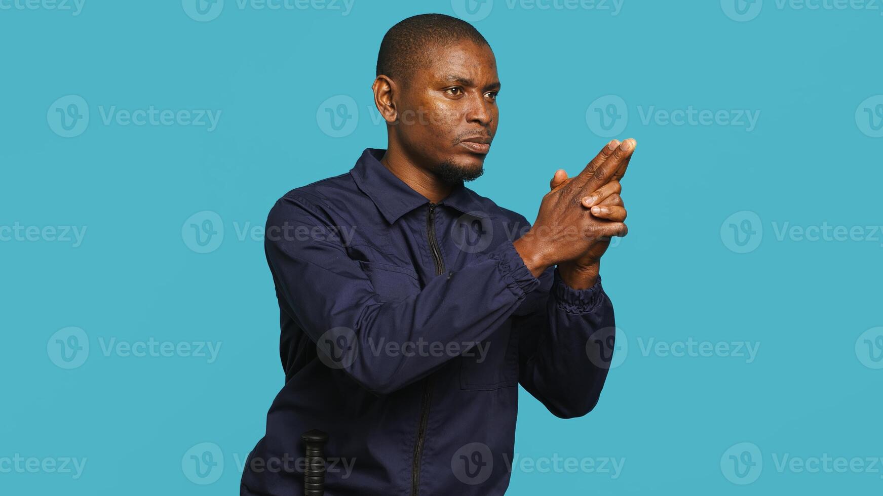 Security guard doing pretending to shoot gun hand gesture while being tasked with preventing criminal activity. Portrait of bodyguard doing pistol fingers gesturing, studio background, camera A Pro Photo