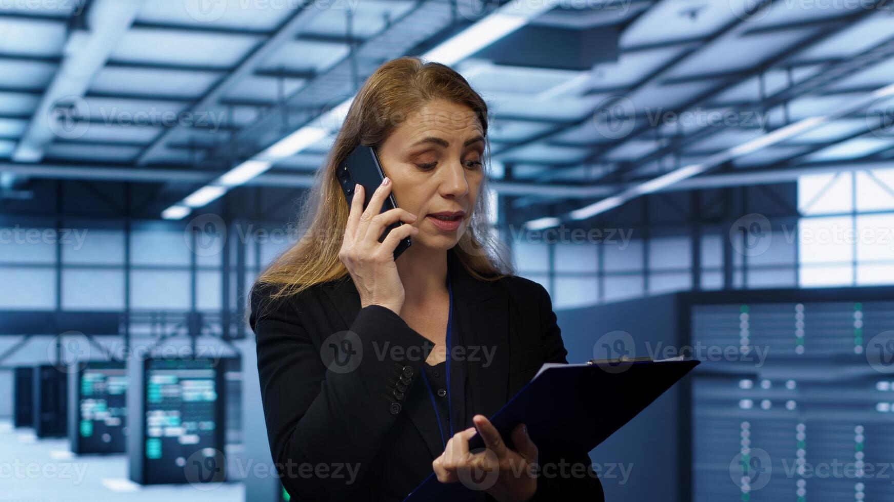 IT specialist looking over data center maintenance checklist, talking on phone in server farm. Employee surrounded by server racks talking during telephone call, camera A Pro Photo