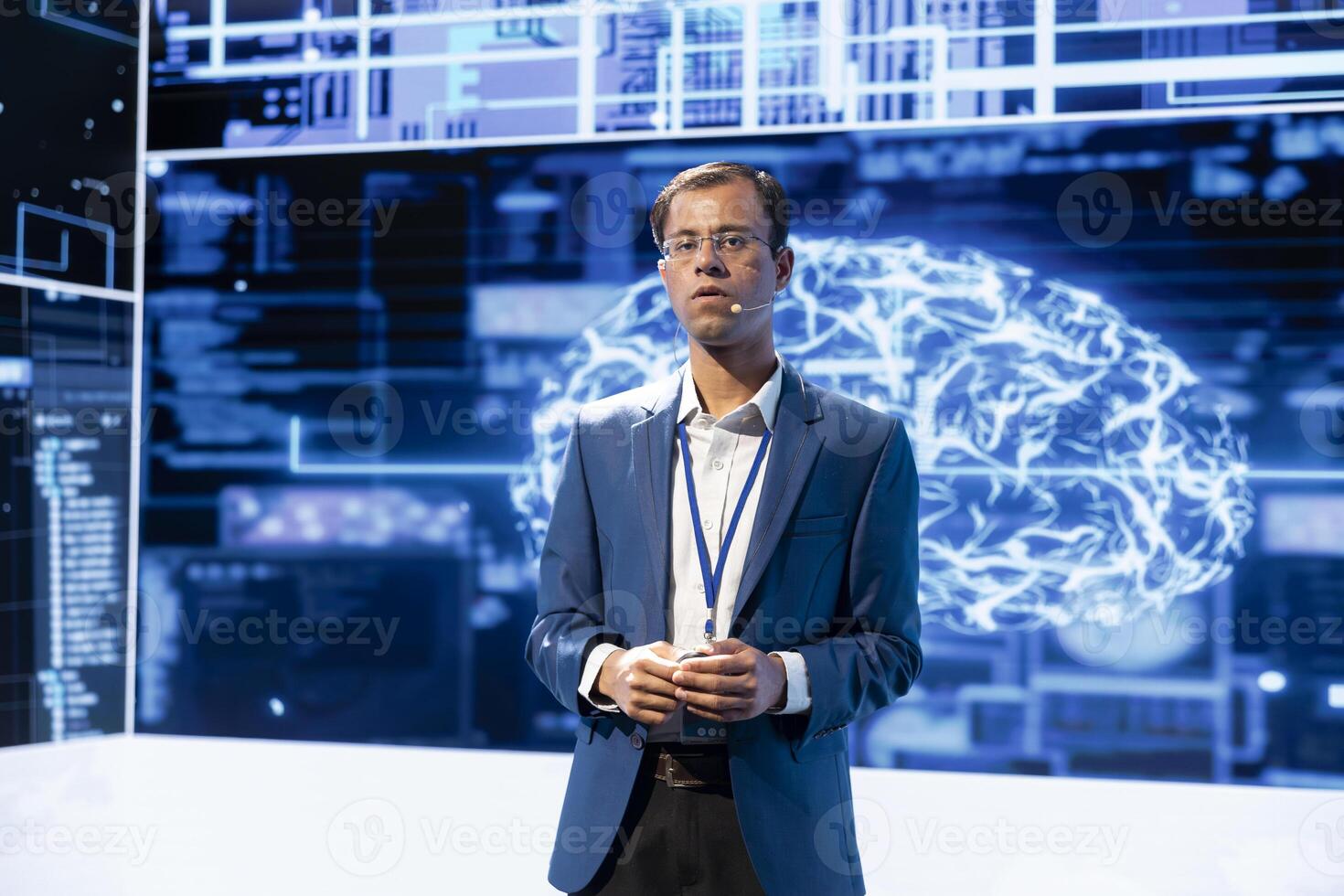 Engaging speaker talking at AI convention, sharing industry expertise to inspire audience. IT specialist exploring latest artificial intelligence solutions, technologies and tools at tech event Pro Photo