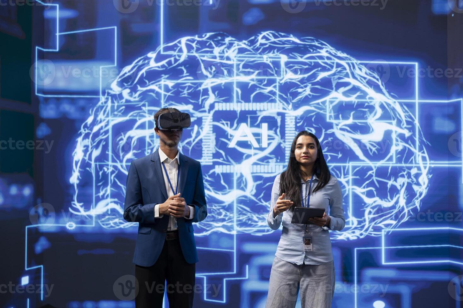 Portrait of specialists doing virtual reality demonstration at AI convention gathering tech startups. Engineers at summit event showing how to use VR goggles and artificial intelligence technology Pro Photo