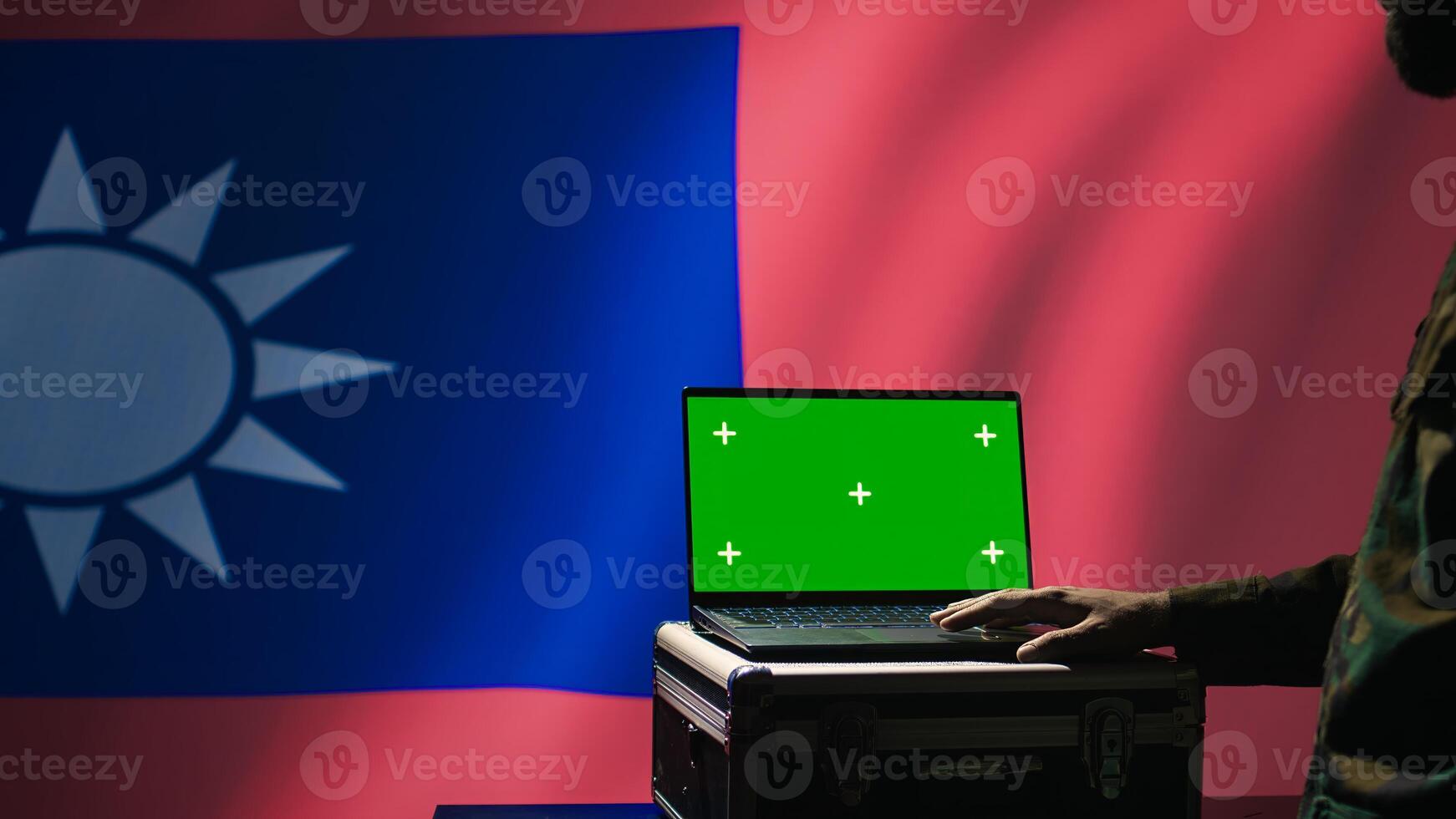 Taiwanese insurgent using military tech on green screen laptop to identify threats from enemies. Taiwan freedom fighter using software on mockup notebook to relay info to war front lines, camera B Pro Photo
