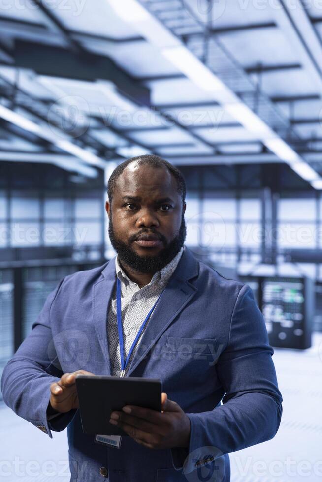 Technician in server hub workplace installing newly ordered storage unit, checking parameters with tablet. IT expert in data center holding device, replacing storage mainframes components Pro Photo