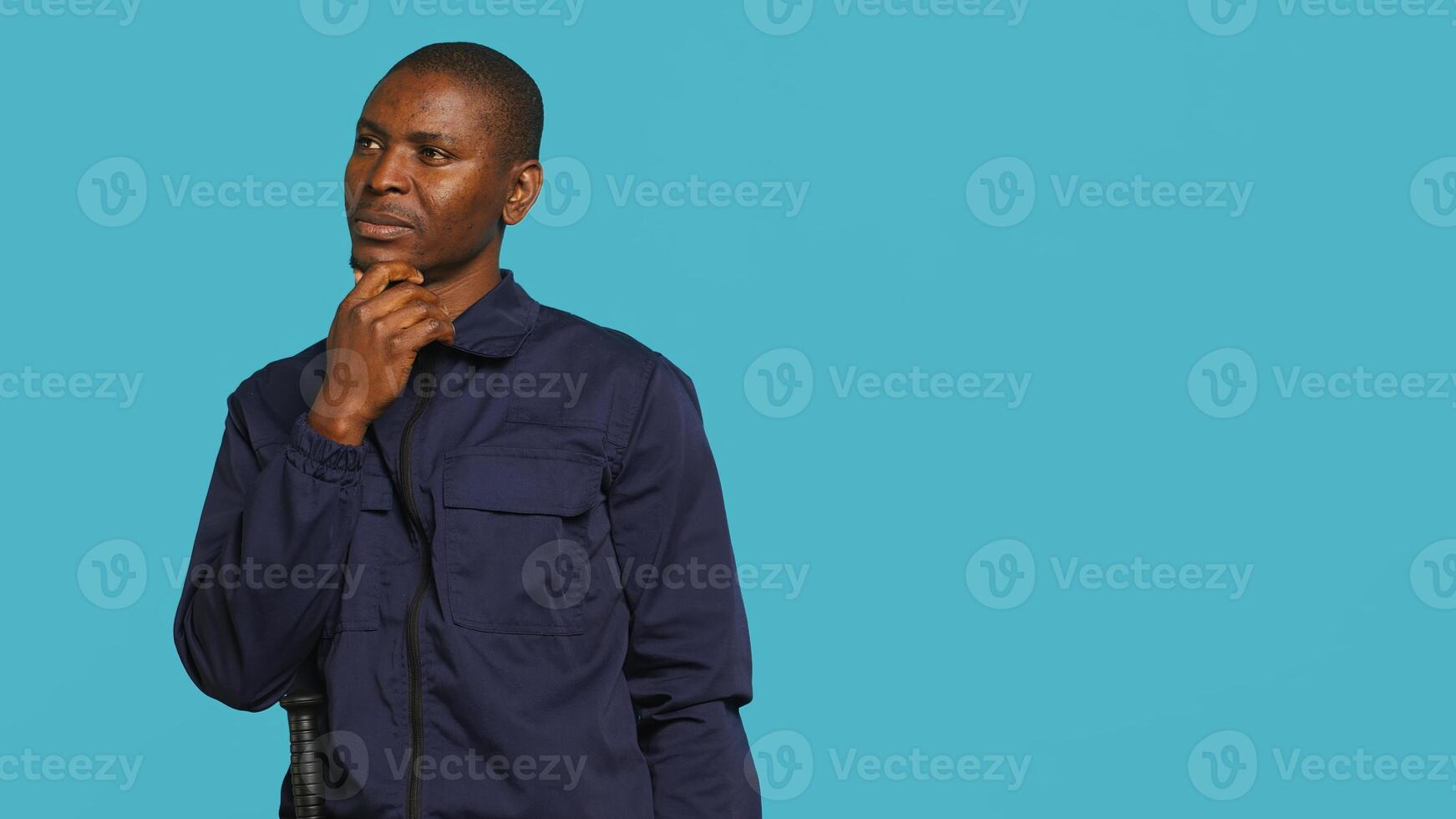 Security guard doing thinking hand gesture, being tasked with preventing criminal activity and detaining suspects. Portrait of pensive bodyguard rubbing chin, studio background, camera A Pro Photo