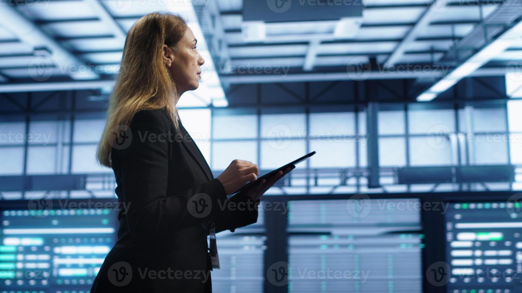 Engineer in server hub checking recovery plan on tablet, monitoring rackmounts energy consumption. Woman in data center making sure rigs are functioning optimally, doing routine disk checks, camera A Pro Photo