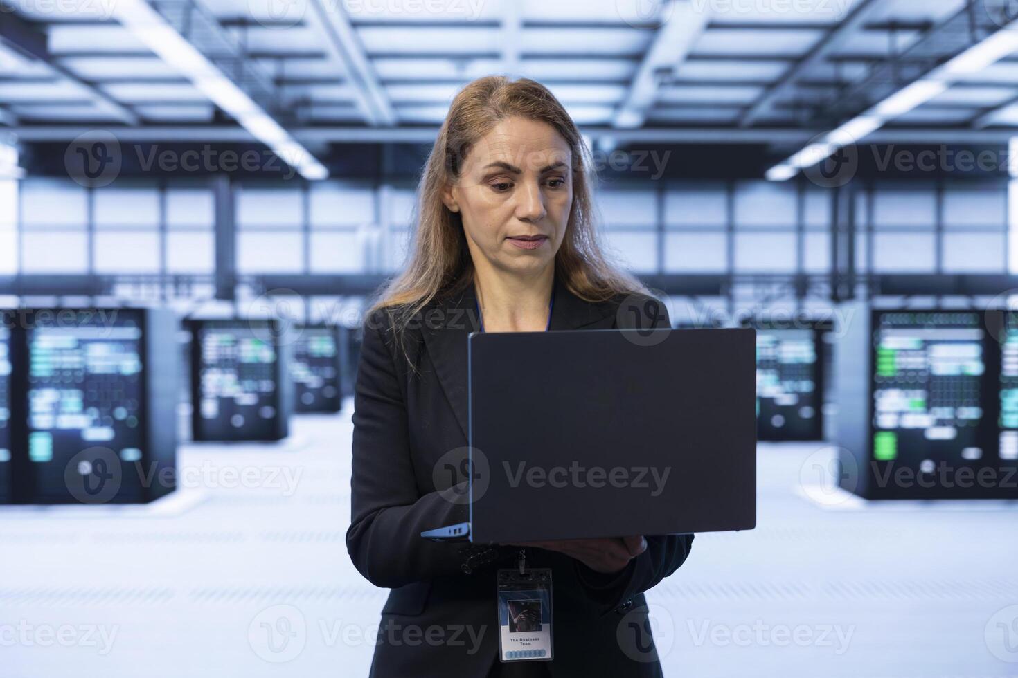 Technician in data center implementing backup solutions to protect against data loss using notebook, ensuring efficient recovery processes. Server hub worker identifying and resolving technical issues Pro Photo