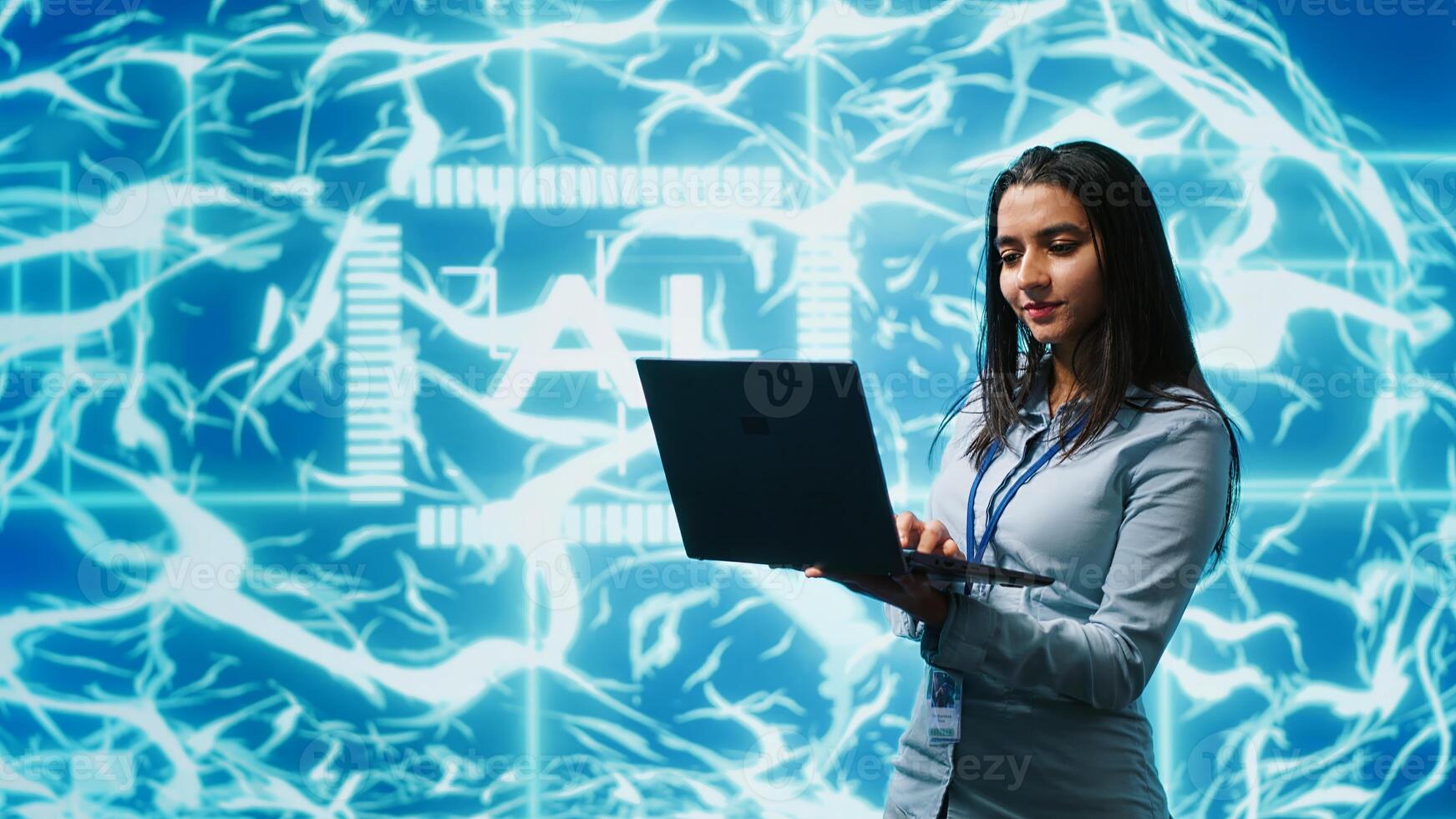 Technician using laptop to maintenance artificial intelligence neural networks made up of interconnected nodes layers. Admin using AI system aiding in processing and transmitting information, camera A Pro Photo