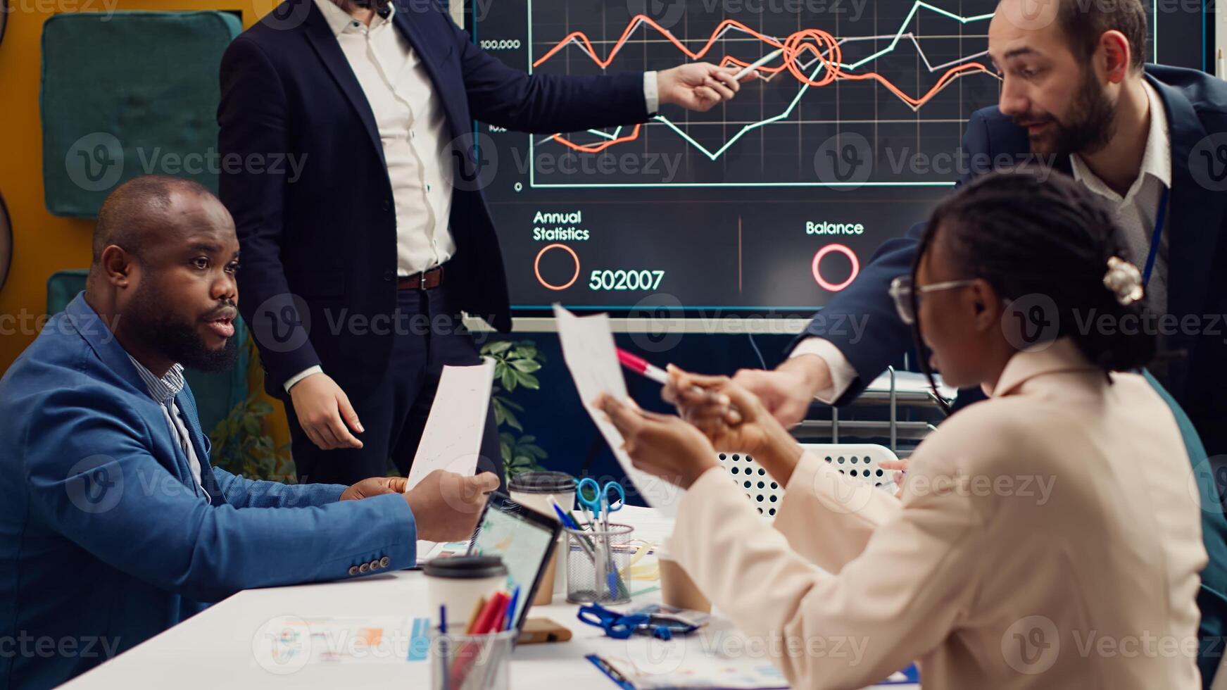 Project team colleagues examining sales infographics on presentation, reviewing annual reports to understand what needs to change in order to expand the business internationally. Camera A. Pro Photo