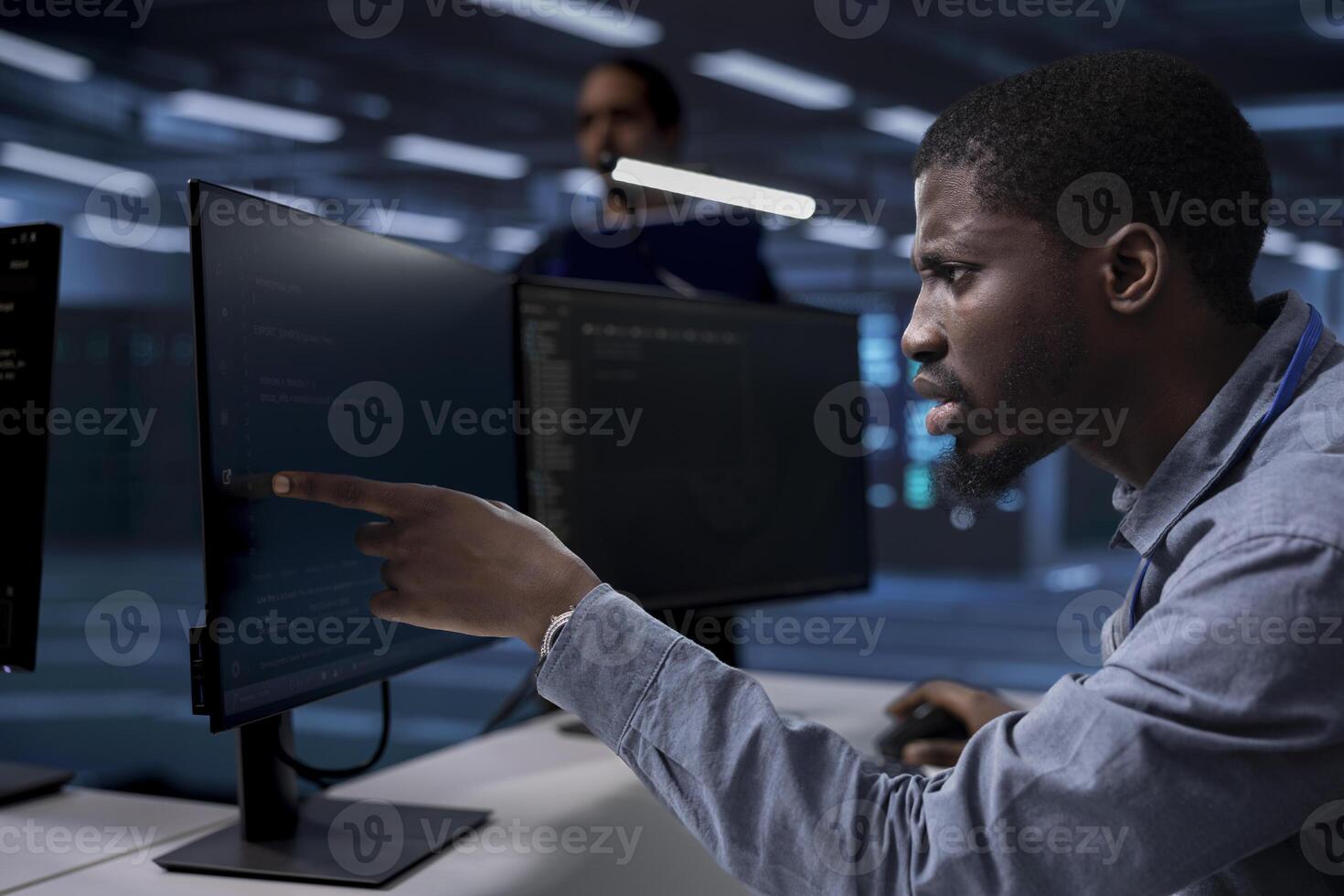 Server hub technician frowning, confused by errors on screen while shielding data from potential threats. Surprised african american man puzzled by malfunctions on data center hardware Pro Photo