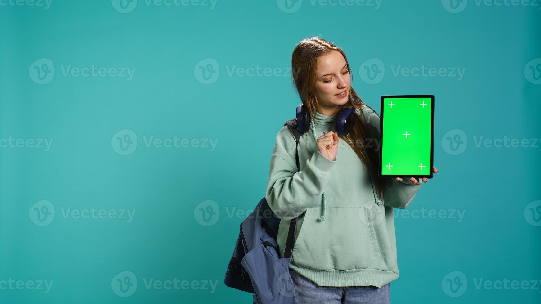 Portrait of woman presenting tablet with chroma key display, isolated over studio background. Young girl creating promotion with blank copy space mockup digital device, camera B Pro Photo
