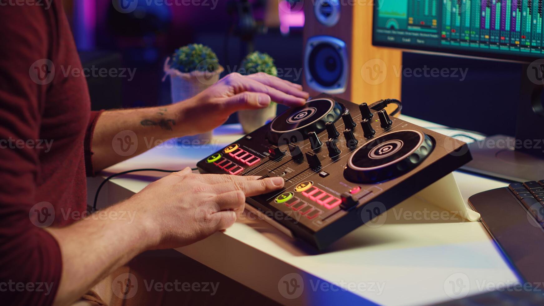 Sound engineer mixing and mastering sounds with electronic audio console, pressing controls and pre amp knobs. Music producer improving sound quality, synchronize soundtracks. Camera A. Pro Photo