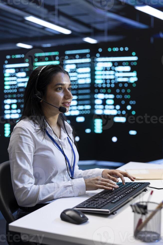 Data center call center agent responsible for providing logistics support to businesses. Worker in server farm establishment overseeing infrastructure systems and communicating with engineers Pro Photo