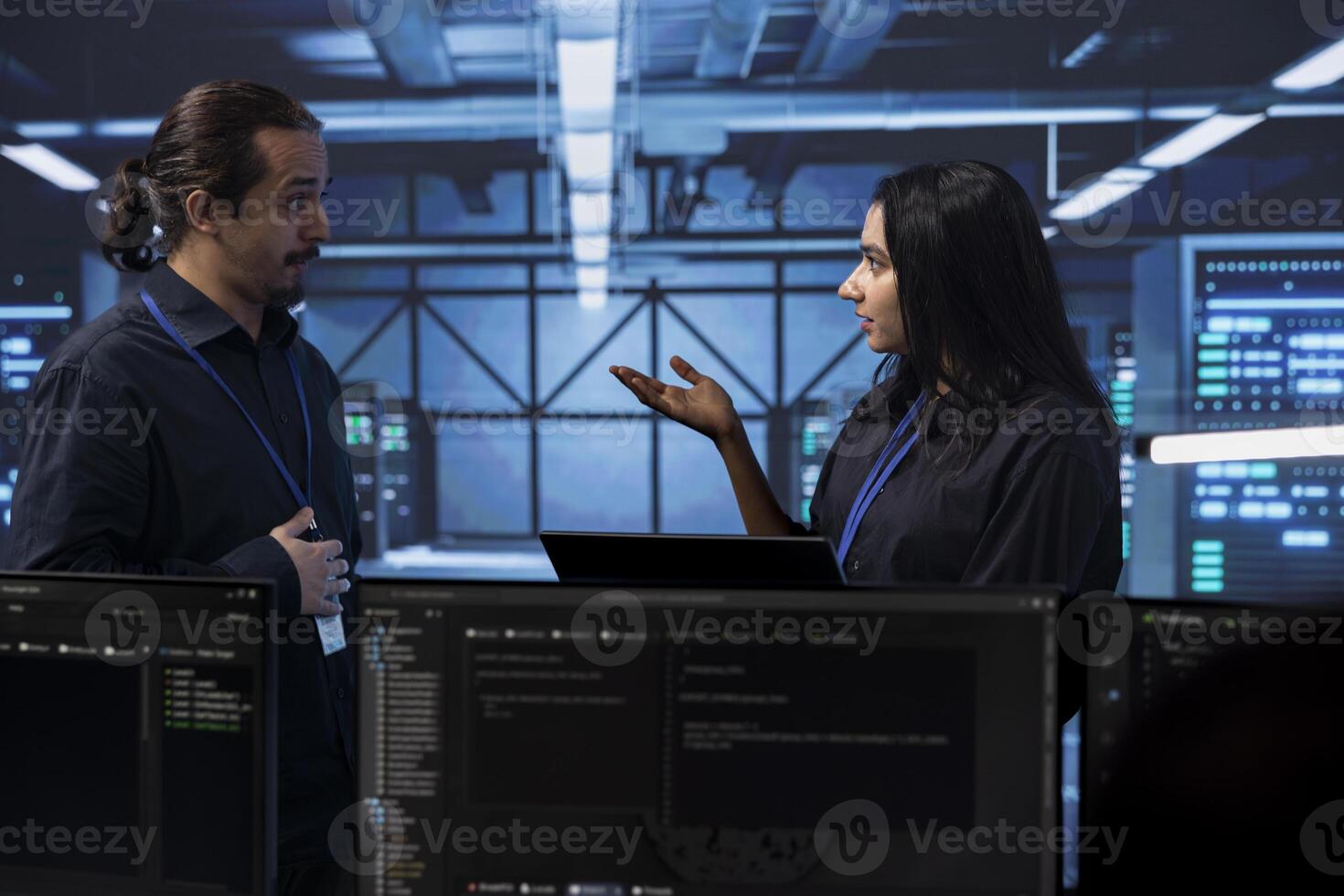 Programmers in server room discussing next steps after checking recovery plan and monitoring energy consumption. Colleagues in data center location talking about routine disk checks results Pro Photo