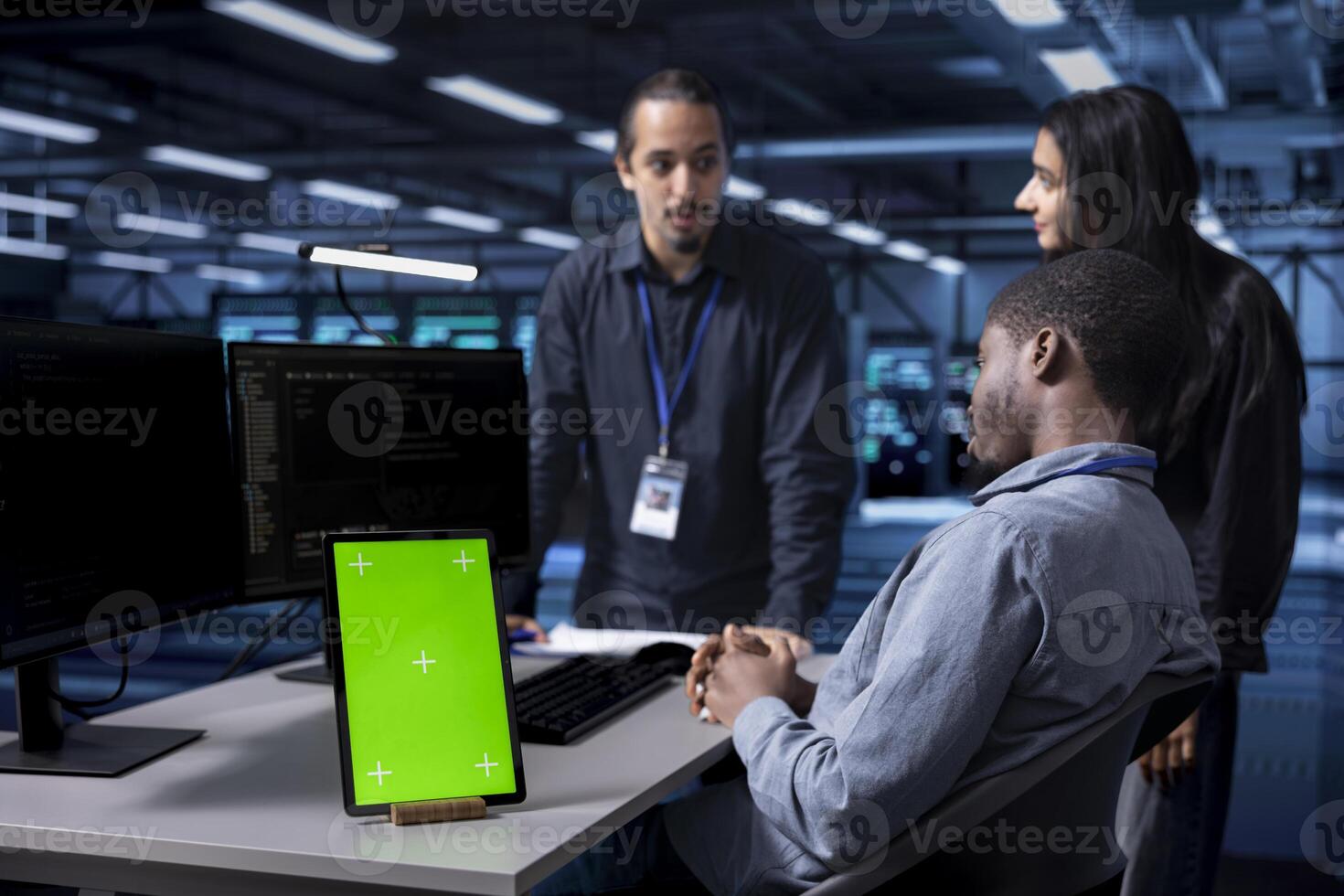 Multiethnic engineering team works on green screen tablet in data center housing storage gear. Diverse staff members using mockup device in server hub with networking components Pro Photo