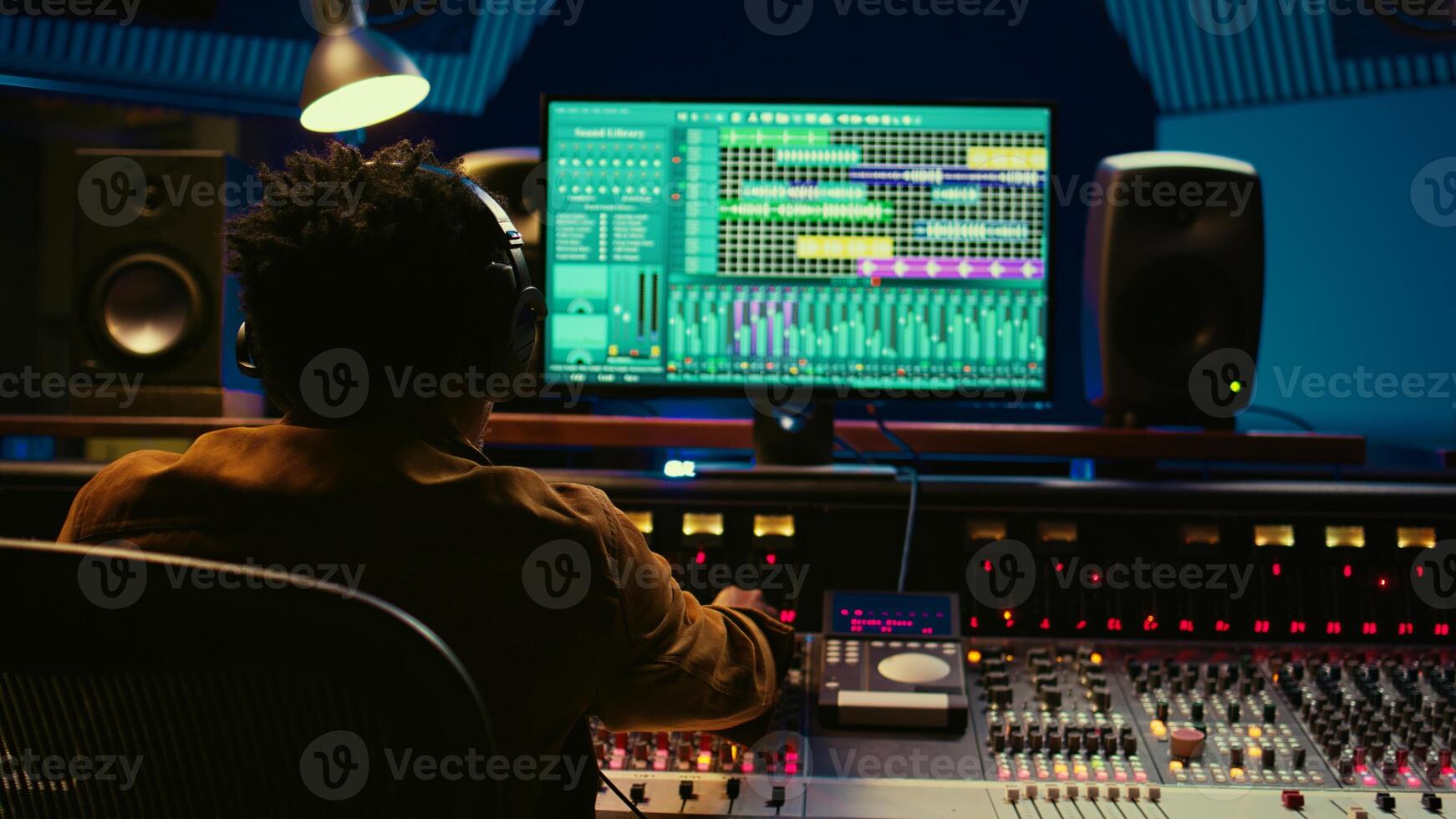 Audio designer leveling sound on a mixer control desk, professional music studio concept. Producer turns up volume and adding effects on a mixing console, recording live tracks. Camera B. Pro Photo
