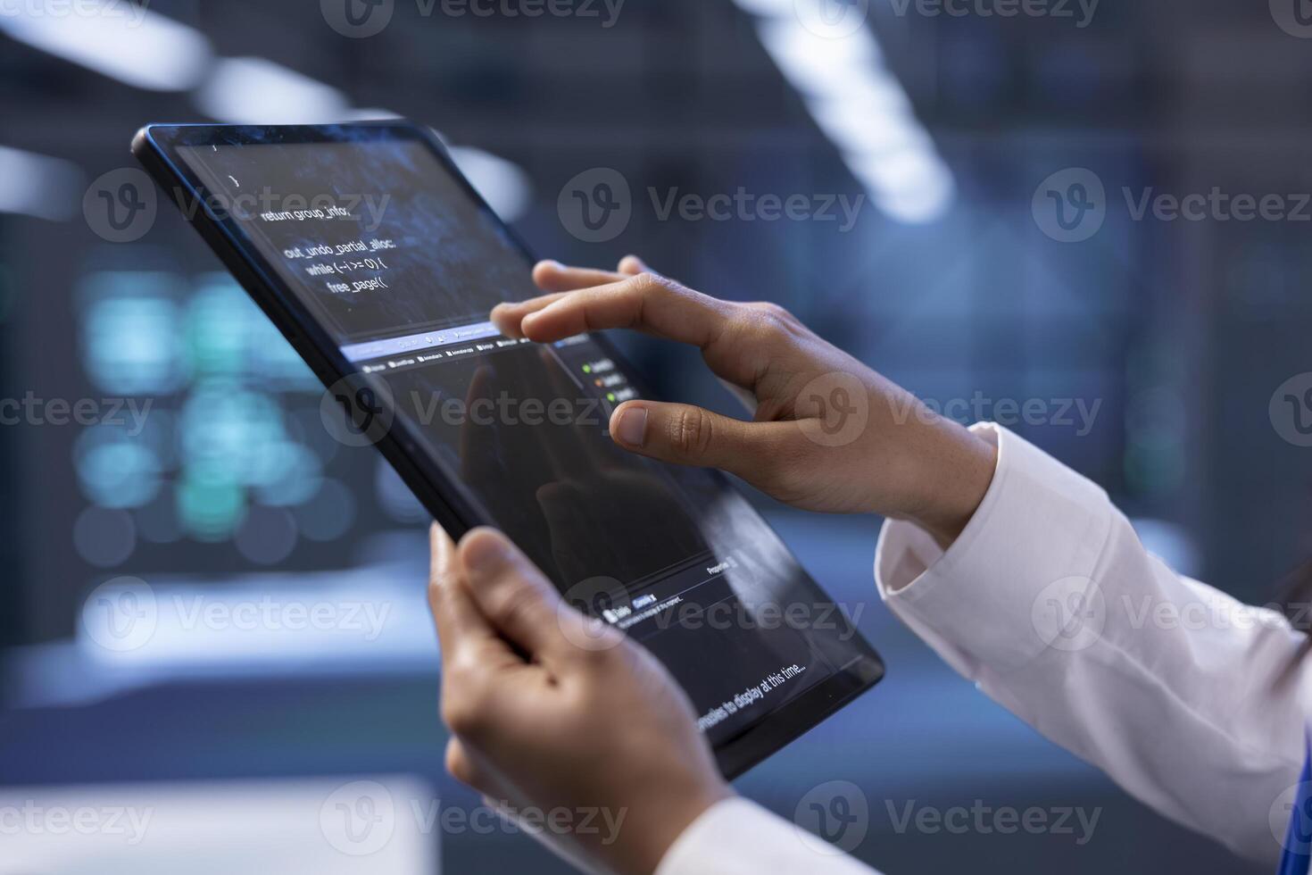 Engineer checking recovery plan on tablet, monitoring data center energy consumption. Employee in server room making sure sensors are functioning optimally, doing routine disk checks, close up Pro Photo